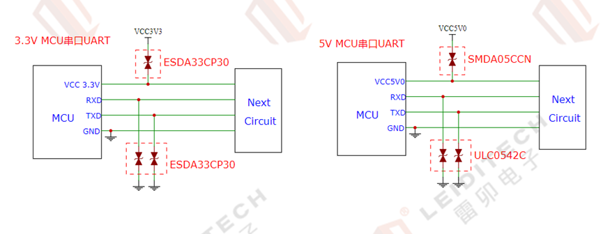 - General ESD protection: Recommended is Leiditech ESDA05CP30, with a working voltage of 5V and a breakdown voltage of 5.6V, complying with IEC 61000-4-2 ESD contact discharge ±8kV), suitable for sensors with 5V signals, can effectively prevent human static electricity from breaking through the sensor pins, and has a response time as fast as 1ns, without affecting signal transmission.