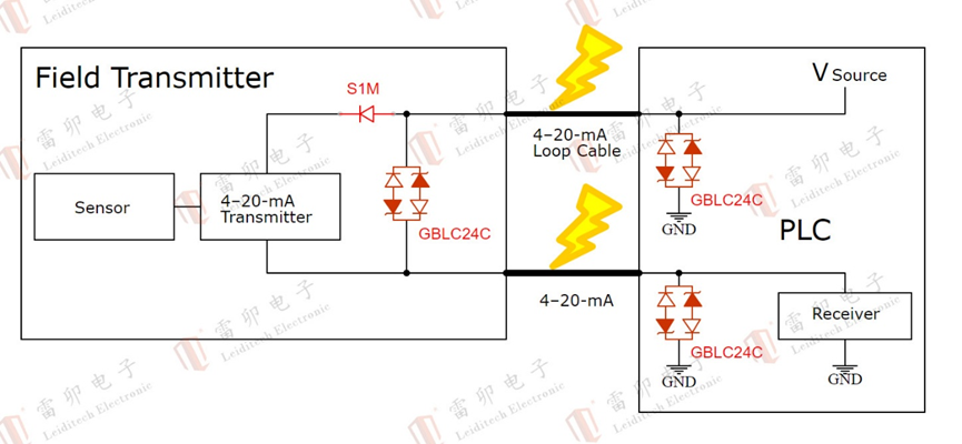 - Analog output (4-20mA): It is recommended to use the GBLC24C from Leiditech. With a reverse breakdown voltage of 24V, it is specifically designed to be compatible with industrial analog signals. It protects against electrostatic signals while not affecting the transmission of the 4-20mA current signal. It is an excellent choice for protecting the PLC interface.