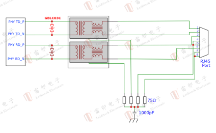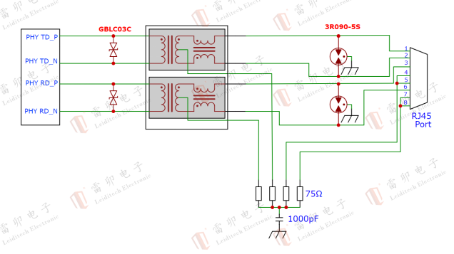 ① Level 1: Surge Discharge: The RJ45 port is connected in series with a lightning arrester 3R090-5S GDT (gas discharge tube), with a breakdown voltage of 90V, which can discharge 90% of the surge current and prevent large amounts of energy from directly impacting the PHY chip.