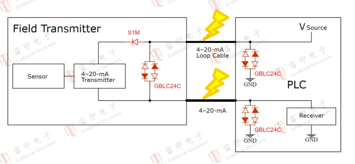 Simulation interface: Leiditech uses S1M and GBLC24C to protect the current output of the 4-20mA sensitive sensor chip. It features small package, low capacitance, and large current protection. It meets IEC 61000-4-2, level 4, with contact discharge of 30kV and air discharge of 30kV.。