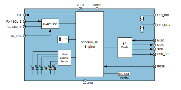 As shown in the figure, the interface of the multispectral sensor chip mainly includes the power input port VCC, the signal interface I2C/UART, and the external interface (USB/Ethernet)。