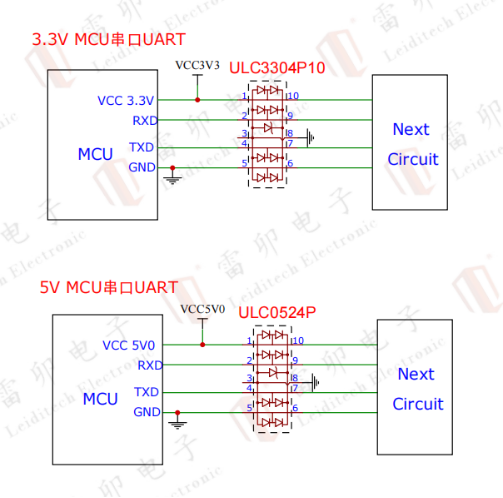 UART interface: Lebao adopts a single-chip protection design to save space and ensure signal integrity. ULC3304P10, ULC0524P are used, meeting IEC61000-4-2, level 4, contact discharge 30kV, air discharge 30kV.