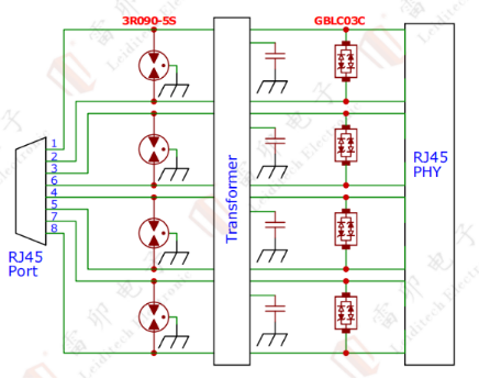 For the 1000M network port surge protection used outdoors, a two-level protection method is adopted. The front stage of the transformer uses GDT 3R090-5S to release the current, and the rear stage uses ESD GBLC03C for precise clamping, with the junction capacitance being less than 0.6pF. This ensures the integrity of the signal under high temperatures and meets IEC61000-4-2, level 4, contact discharge of 30kV, air discharge of 30kV. IEC61000-4-5 10/700μs, 40Ω, 6kV, ±5 times. This solution ensures no packet loss during high-temperature transmission.