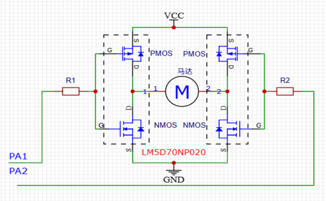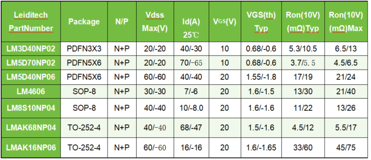 A full-bridge or half-bridge circuit is composed of 4 MOSFETs, or two sealed (N+P) MOSFETs from Shanghai Leiditech are used to precisely control the turn-on and turn-off of the MOSFETs. This allows for controlling the direction, speed (via PWM pulse width modulation) and start/stop of the motor. Switching loss and conduction loss are the key factors. The N+P sealed MOSFET is simple to drive and has a smaller circuit size. The following figure shows the sealed version.。