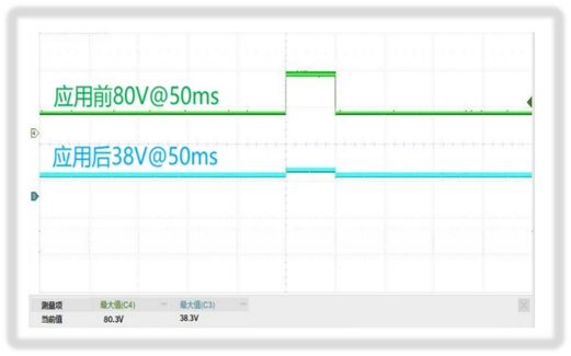 - Regarding surge testing: The module can clamp the 80V to 100V transient surge voltage to 38V within 50ms (based on actual measured data), which is lower than the "load safety voltage threshold" stipulated by the standard, thus preventing the DC-DC converter and sensors from being damaged.