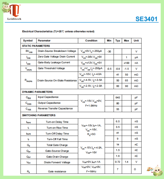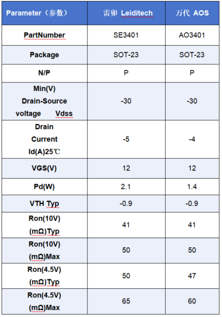 Shanghai Leiditech's PMOS model SE3401 is a pin-to-pin alternative to AOS's model AO3401. Many customers have already chosen SE3401 to replace AO3401, and they can enjoy better prices and faster delivery times. It is especially favored in some small electronic devices with space limitations. The parameter comparison is as follows:
