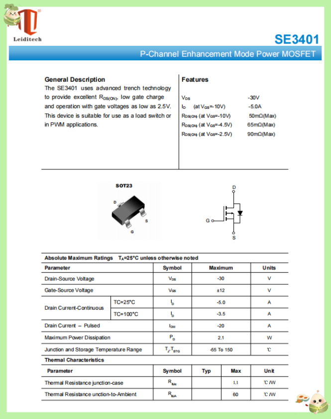 In conclusion, the SE3401 boasts three key advantages: low internal resistance, fast response, and small size. As a result, it is an ideal choice for power protection, portable devices, motor drives, and industrial systems. If a substitute solution is needed (such as a domestic alternative), the Leiditech brand can offer a Pin-Pin compatible solution of the same model, with lower cost and similar parameters. For specific design suggestions, please refer to the SE3401 device manual to ensure compatibility.