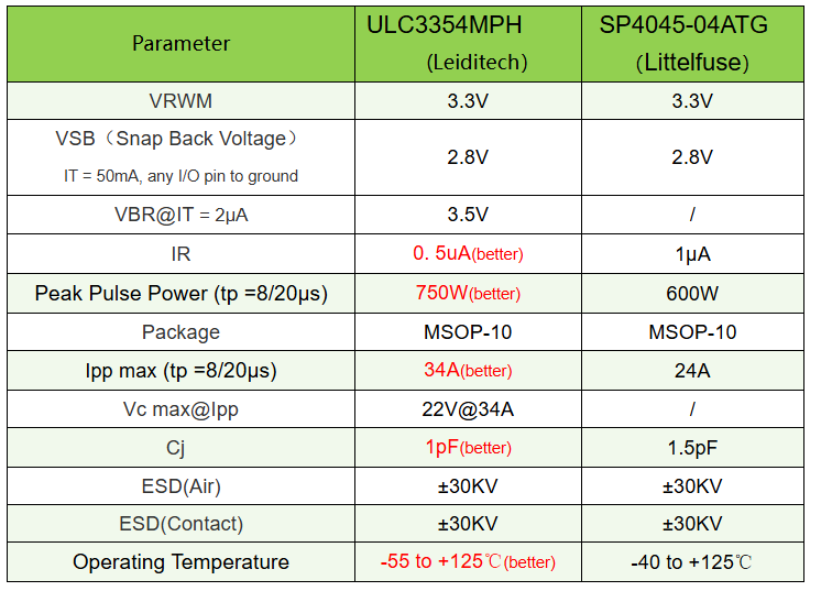 Leiditech Electronic as a leading manufacturer in the ESD protection field, it has provided a mature and complete alternative solution for Littelfuse's product line. The Leiditech ULC3354MPH is a 3.3V four-channel low-capacitance TVS diode array, packaged as MSP-10. The ULC3354MPH can completely replace the Litt SP4045-04ATG. The parameter comparison is as follows: